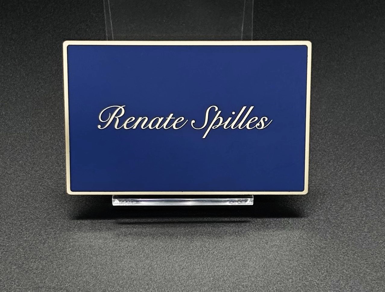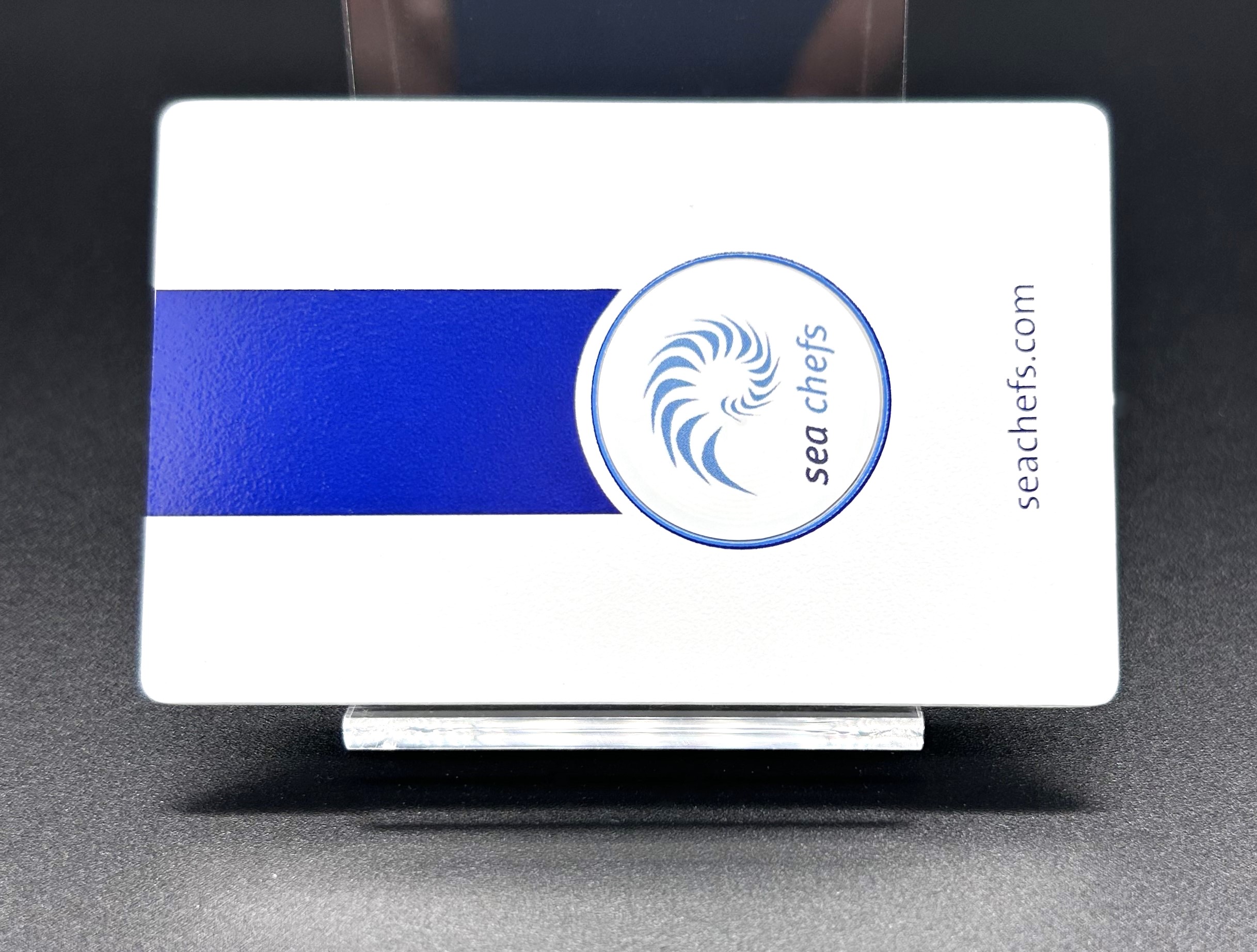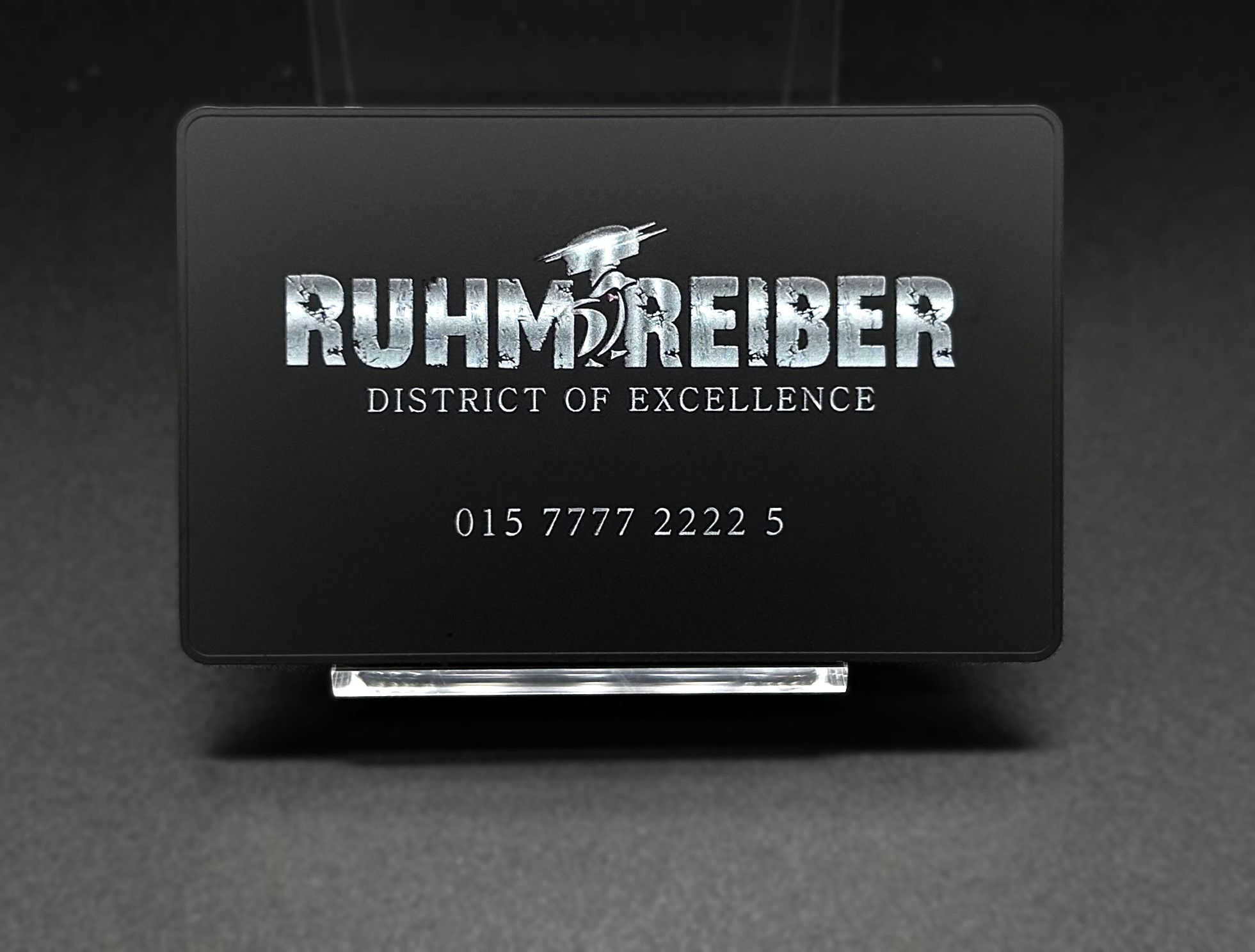 Die Ausprägung ist das Gegenstück der Einprägung. Hier wird ein dickeres Material verwendet und anschließend die Karte um etwa 0,1 mm ausgefräst. So erhebt sich das Logo, der Schriftzug oder das Piktogramm von der Karte. Diese Veredelung ist selbstverständlich auf der Rückseite nicht zusehen.