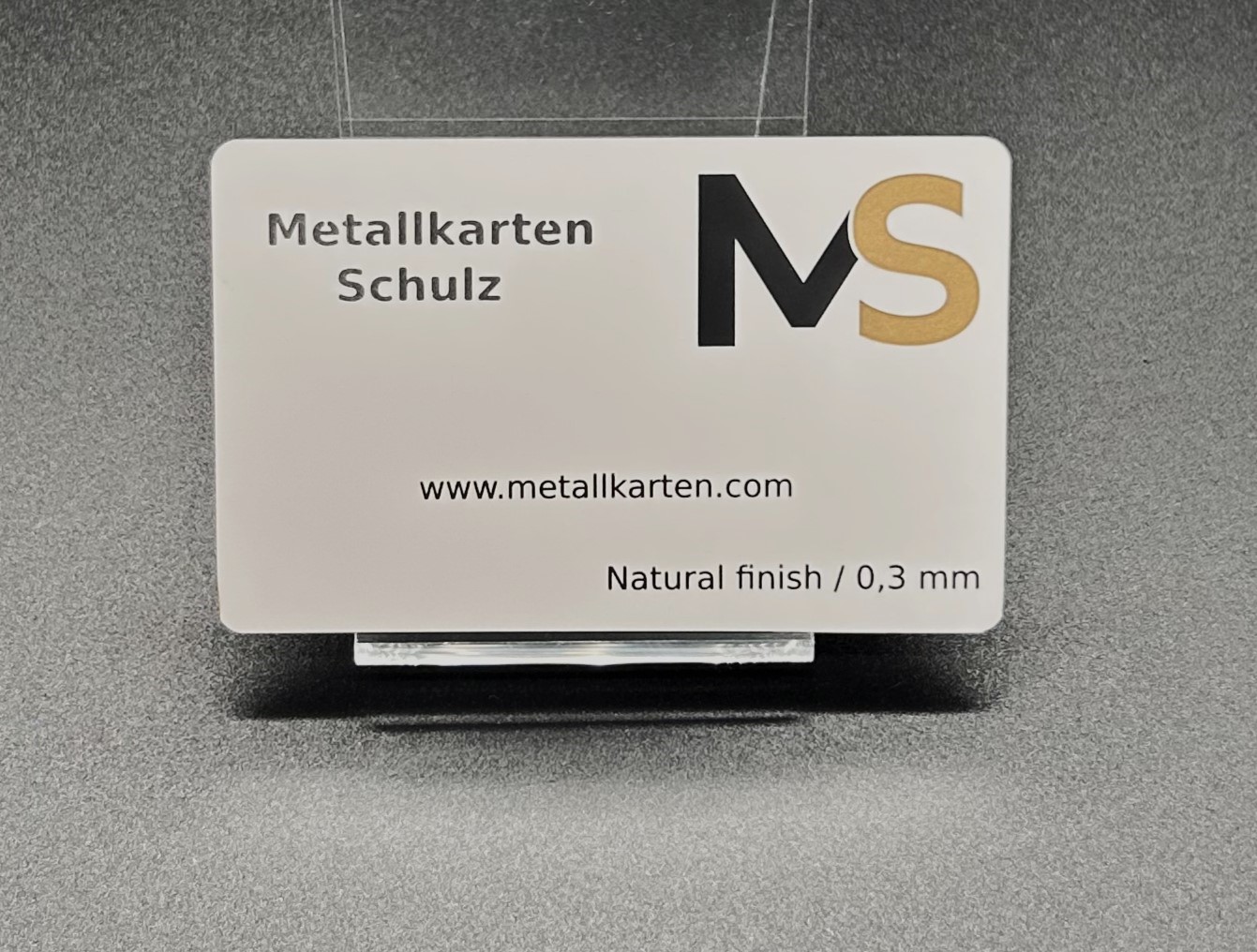 Die unbehandelte, bzw. matte Oberfläche passt sehr gut zu dezenten und schlichten Designs. Dies vermittelt subtil die Wertigkeit einer solchen Metallkarte und passt sich sehr gut an unterschiedlichen Umgebungen an. Fingerabdrücke sind durch diese Veredelung wenig zu erkennen. Bei Karten mit einer farblichen Bedruckung kann die Karte matt oder glänzend hergestellt werden.